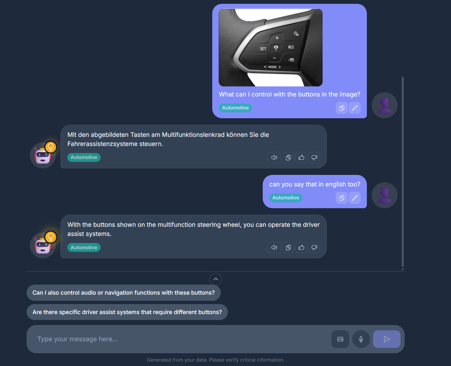 Even searching using an image is possible. semvox explain recognizes the depicted object and searches the provided documents for the answer to the question “What is this?” A follow-up question can then be asked, for example, about its exact function.